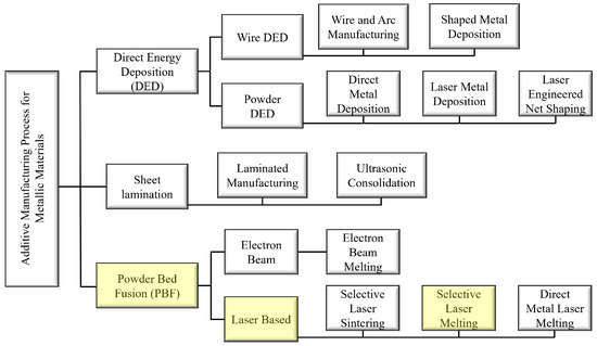Main additive manufacturing technologies for metallic materials. Highlighted in yellow is the process used to manufacture the specimens in this study.