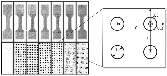 To introduce controlled variability in porosity, the specimens were designed with different volume fractions of voids, ranging from configurations with no controlled porosity (H0 and V0) to configurations with low theoretical density (e.g., H7/V7 and H8/V8). Figure 6 shows the specimens produced via LPBF, accompanied by their respective void distributions. This figure highlights the spatial arrangement of the voids, with sizes varying between 0.2 mm and 0.6 mm and spacings between 0.3 mm and 1.5 mm, as detailed in Table 3.