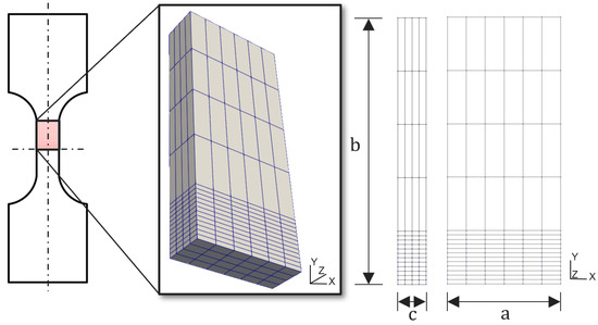Defining the geometry of the specimens and generating the finite element mesh are fundamental steps in ensuring the representativeness of the numerical simulations carried out using the Gurson-based model. The specimens were designed based on the dimensional specifications presented in Table 4, which details the dimensions of the section of interest used in the simulations. The geometry was designed to replicate the experimental conditions of uniaxial traction, allowing analysis of the influence of porosity and printing direction (horizontal and vertical) on the mechanical response of the material manufactured via LPBF.