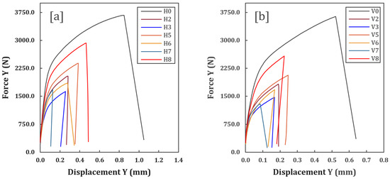 - V7 vs. H7: Fracture occurs at ≈0.12 mm for V7, against ≈0.18 mm for H7.