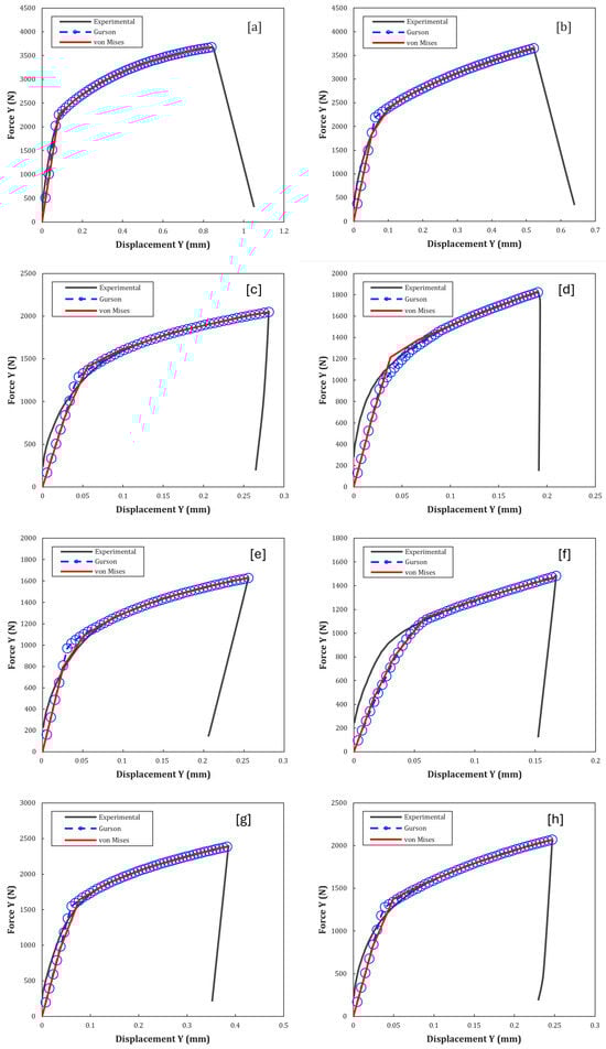 With the results, it is possible to describe the evolution of the plastic strain in the specimens manufactured via AM, simulated numerically using the Gurson model implemented in HYPLAS (see Figure 11, Figure 12, Figure 13, Figure 14, Figure 15, Figure 16 and Figure 17). These curves allow us to evaluate how controlled porosity and printing direction influence material degradation under mechanical loading.