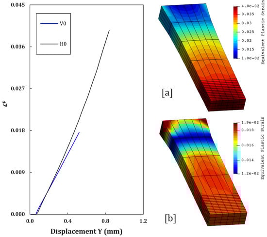 Equivalent plastic strain contours at [a] = H0, and [b] = V0.