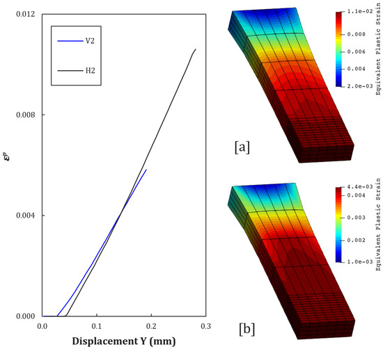 Equivalent plastic strain contours at [a] = H2, and [b] = V2.