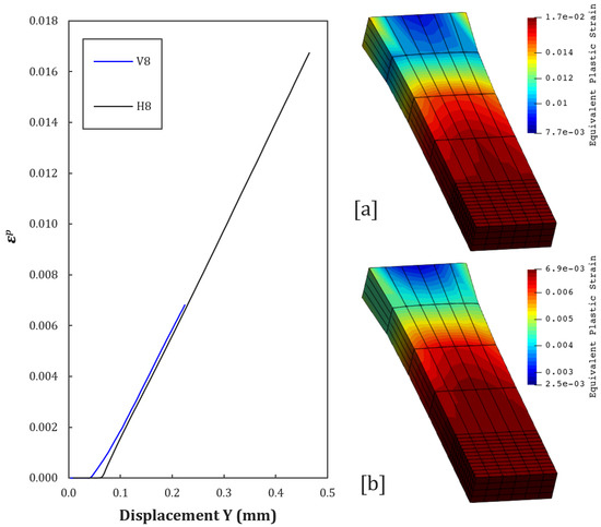 Equivalent plastic strain contours at [a] = H8, and [b] = V8.