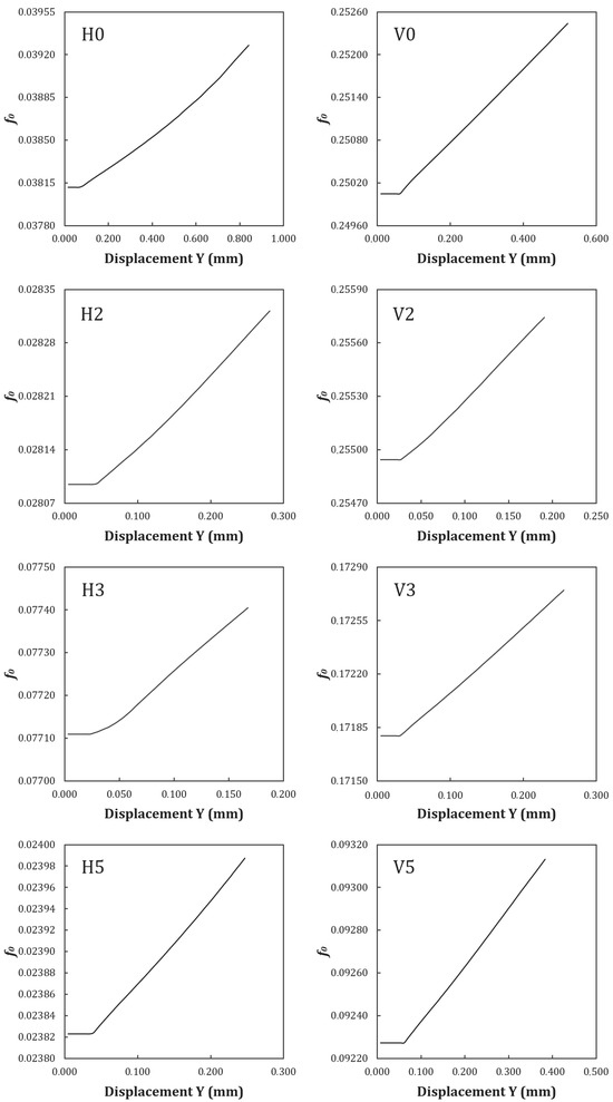 Figure 18 and Figure 19 show that the configurations with the highest initial porosity (H6, H8, and V6, V8) reach the point of porosity acceleration at smaller displacements than the configurations with the lowest porosity (H0, H5, and V0, V5). This is to be expected, as a higher void volume fraction () reduces the effective load-bearing area, anticipating damage initiation.