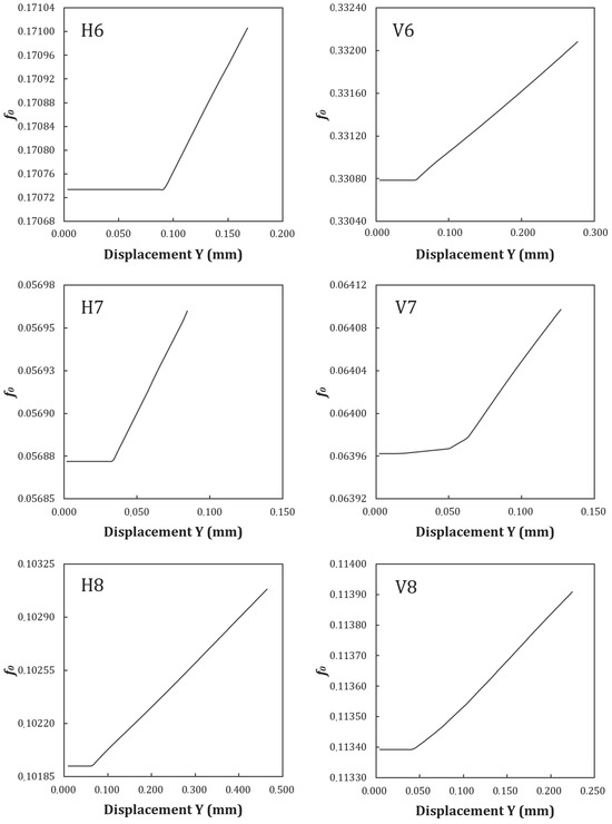 In general, the vertical specimens (V0, V3, V5, V6) have higher than the horizontal ones, except in specific cases explained by their low densities, which compromise the isotropic hardening of the material (V7 and H7). V8 and H8 have practically the same value of , but V8’s is still higher than H8’s. The size and spacing of the voids affect the interaction between them during deformation. Larger and more widely spaced voids (as in V6 and H6) can amplify the local effect of stress concentration, especially in the vertical direction, where the microstructure is more susceptible to defects.