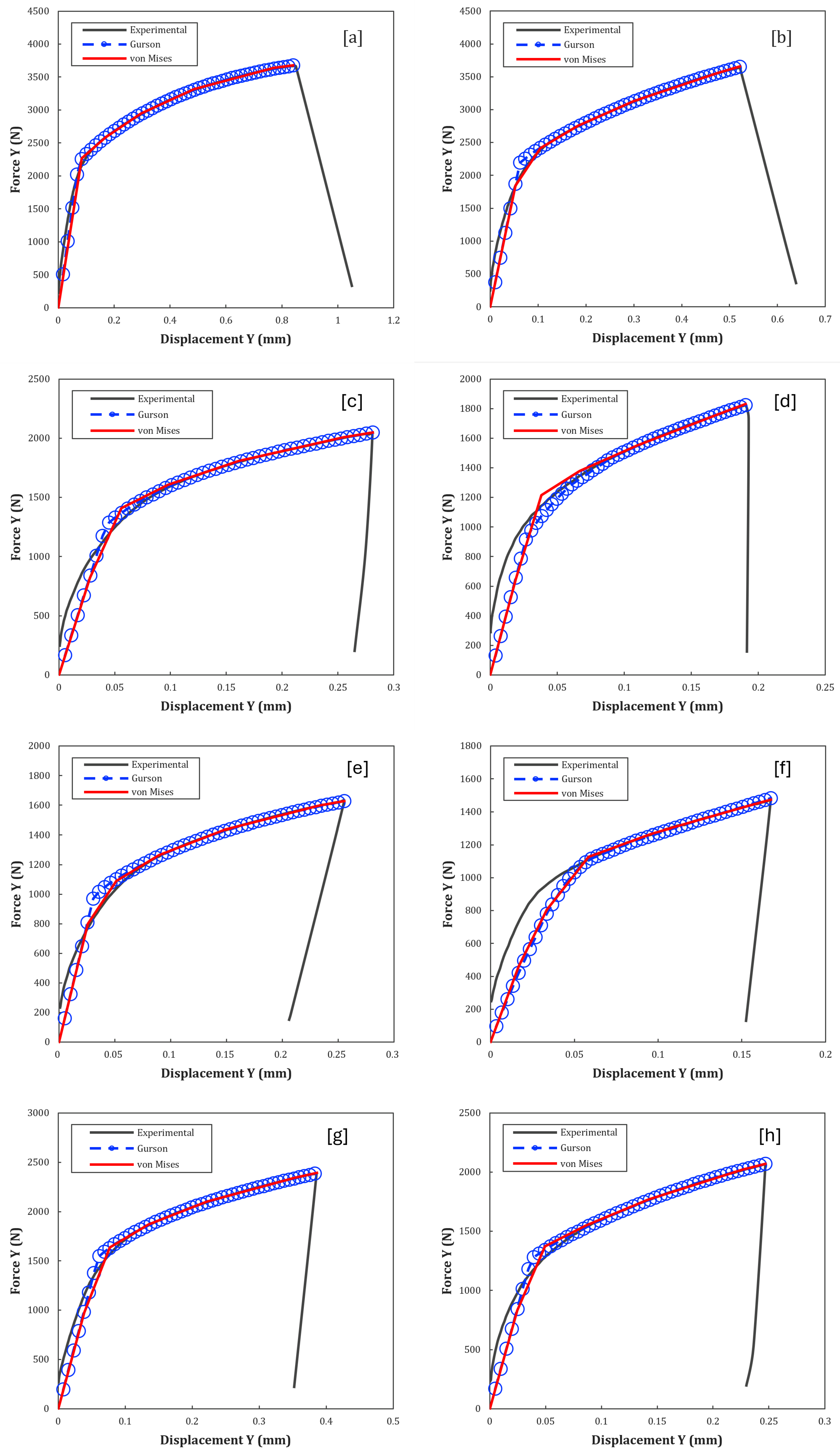 The initial determination of is made directly from the yield point observed experimentally, while is estimated by fitting hardening curves to exponential models. The parameter, which governs the rate of transition between isotropic and kinematic hardening, is derived by analyzing the slope of the stress–strain curve in the plastic phase, using non-linear regression methods. , responsible for coupling the influence of the triaxiality of stresses (p) to the evolution of damage, is calibrated by comparing test results under different stress states (e.g., pure traction, shear).