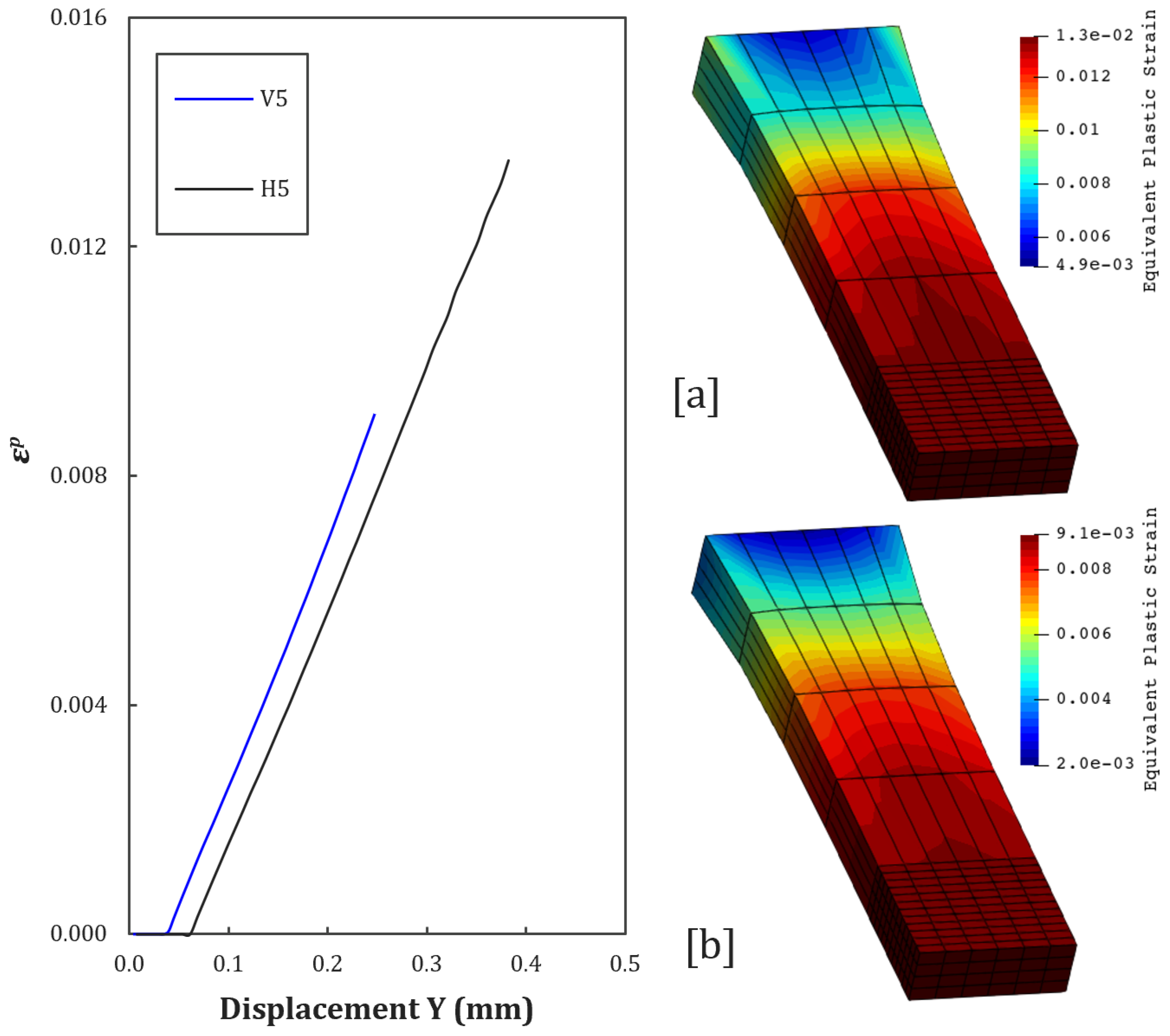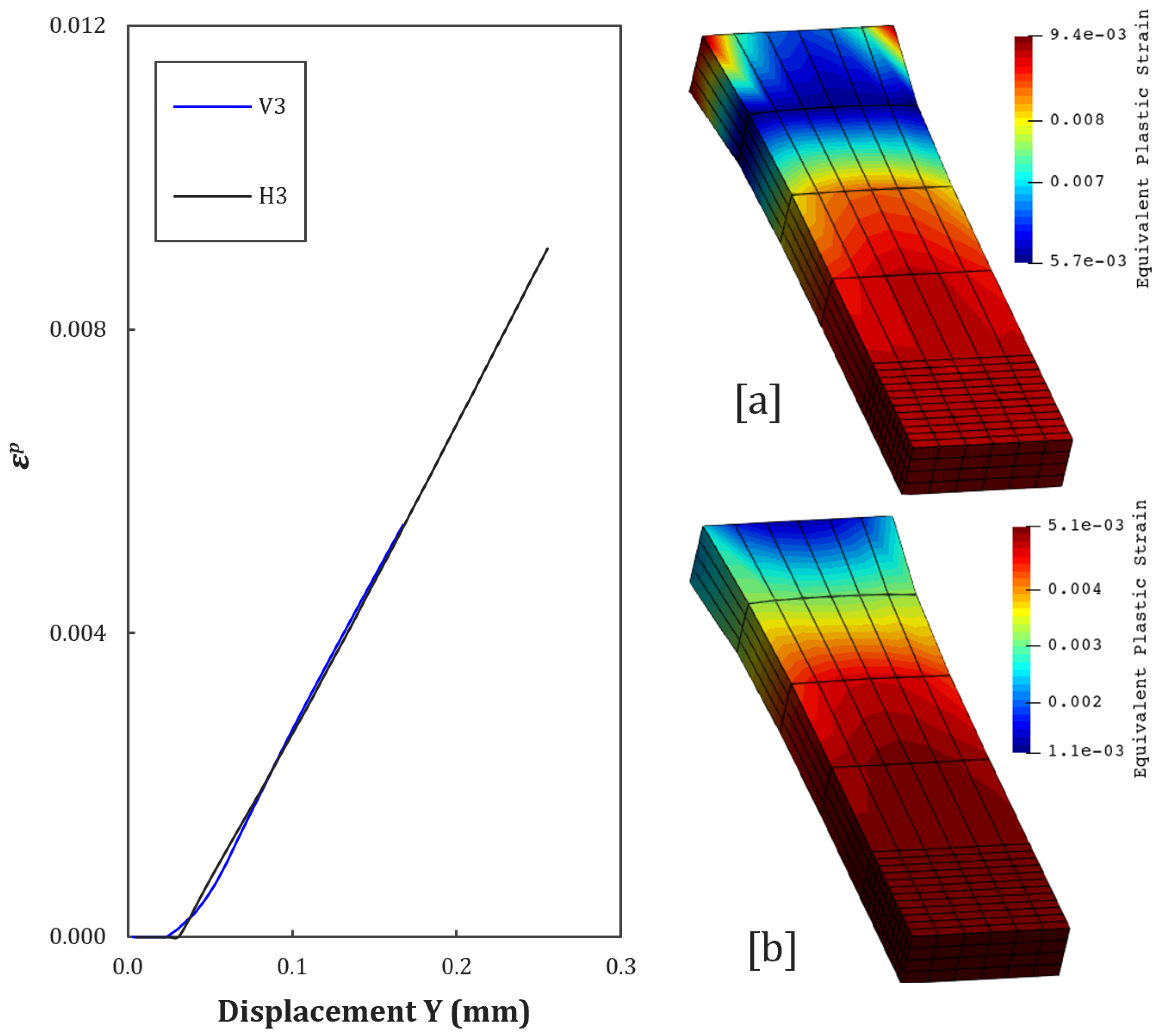 It is important to note that the material’s initial yield strength () is intrinsically linked to the internal variable (), associated with isotropic hardening. In the von Mises context, the equivalent plastic strain takes on the role of this internal variable, establishing a direct relationship between and the history of plastic strain accumulated during loading. In this way, the yield strength is not only used as a criterion that defines the initial strength of the material but also evolves as a function of the progression of plasticity (), reflecting the progressive hardening of the microstructure.