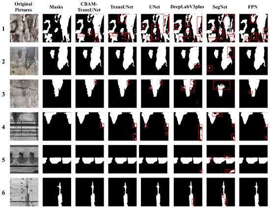 - To validate the performance of the core modules, ablation experiments involved progressively stripping the CBAM and the ViT module away from the CBAM-TransUNet model. The results show that all evaluation metrics decrease to varying degrees. Specifically, the variant model with all CBAMs and ViT modules removed exhibits a significant performance gap compared to the original CBAM-TransUNet, with a difference of up to 7.79% in the IoU metric. Additionally, disparities are observed across other evaluation metrics: The difference in the Dice coefficient is 1.03%; in recall, 2.40%; in precision, 6.20%; in accuracy, 0.96%; and in the F1-score, 4.53%, further confirming the necessity of these two modules in the model.