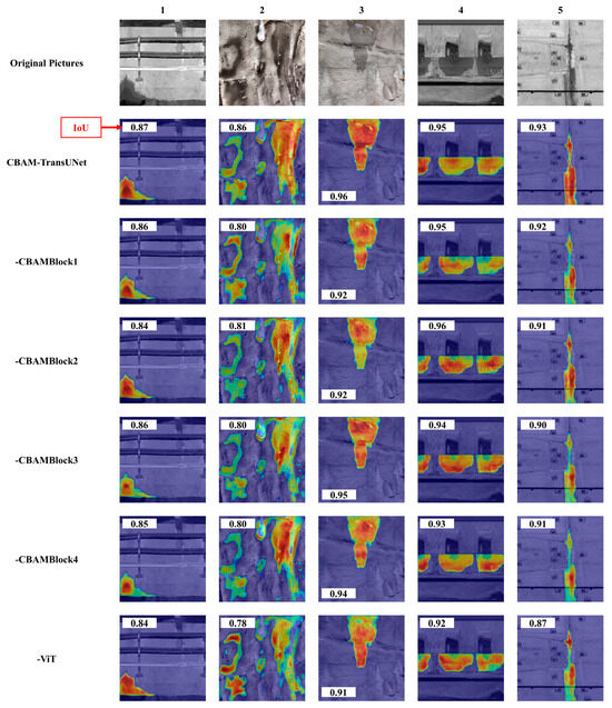 - Analysis of Score-CAM heatmaps for different leakage patterns reveals that CBAM-TransUNet performs stably in detecting corner-type, linear, overall area-type, and mixed-type tunnel leakages. For the aforementioned leakage pattern categories, the differences in the IoU metric before and after the ablation experiments are 3.44%, 6.45%, 5.20%, and 9.30%, in sequence. In contrast to the heatmaps of ablated variant models, the ones generated by CBAM-TransUNet cover leakage areas more completely. The high-activation regions align more closely with real leakage boundaries, and they exhibit stronger spatial continuity. This enables the model to more accurately characterize the spatial distribution features of different leakage forms.