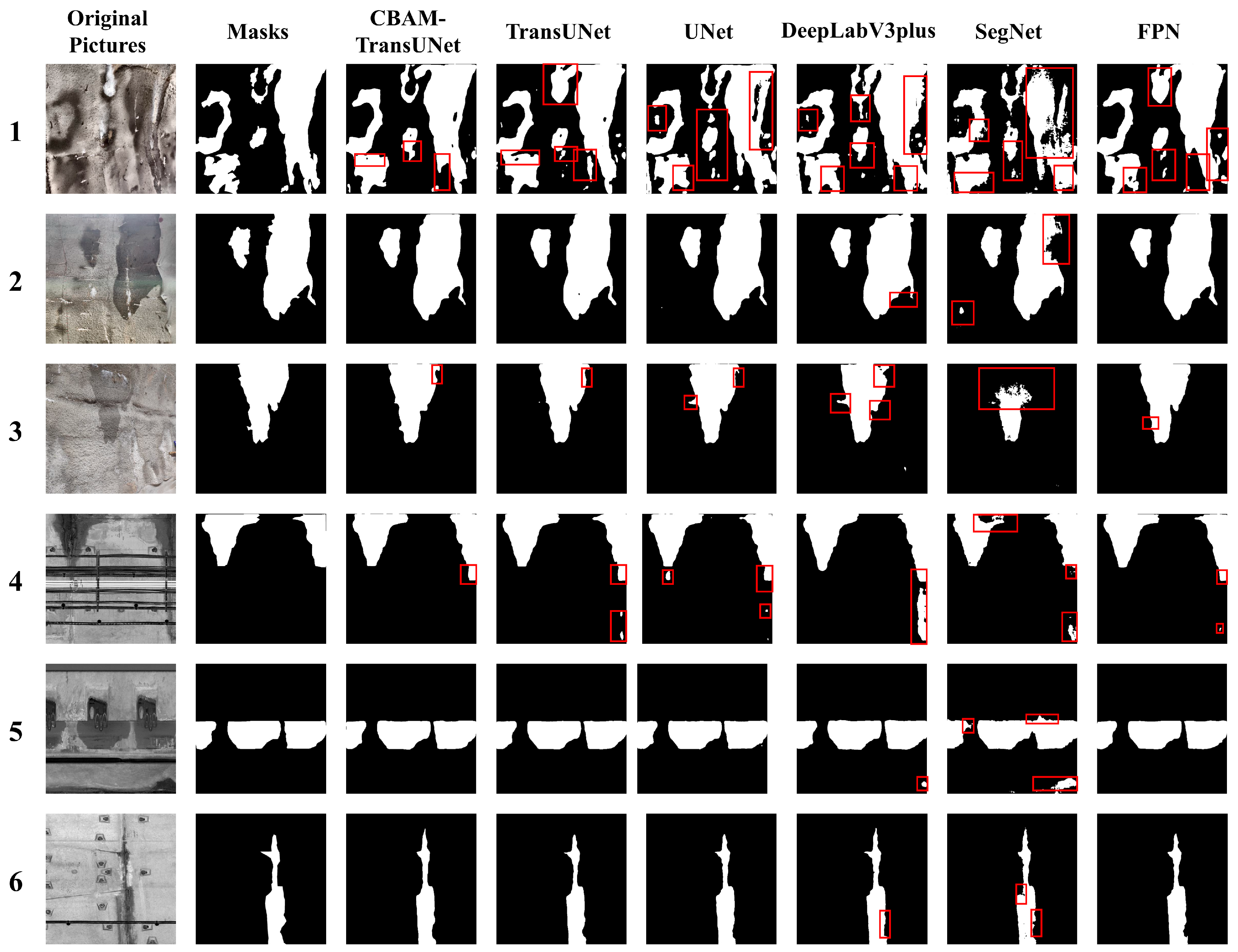 - This paper proposes the CBAM-TransUNet model suitable for tunnel lining leakage detection. After training on the constructed mixed leakage dataset, the model achieves average values of 0.8143 (IoU), 0.8433 (Dice), 0.9518 (recall), 0.8482 (precision), 0.9837 (accuracy), 0.9746 (AUC), 0.8568 (MCC), and 0.8970 (F1-score). Experimental verification demonstrates that the model exhibits strong generality and robustness, capable of effectively handling complex and diverse scenarios, such as the presence of other components on the lining surface, rough textures, surface contamination, low distinguishability between leakage traces and background, and partial occlusion of traces.