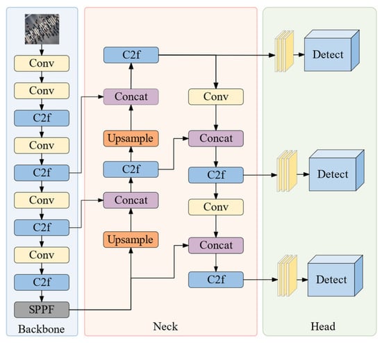 YOLOv8 represents a cutting-edge deep learning model in the field of object detection, widely applied in real-time detection tasks due to its rapid processing speed and high accuracy. The network architecture of YOLOv8 is depicted in Figure 1.