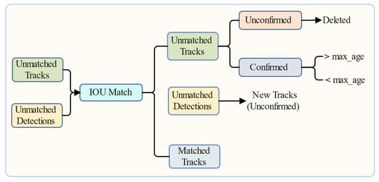 In this schema, the output from YOLOv8 serves as the input for ByteTrack, which includes unmatched tracks and unmatched detections. When employing the Intersection over Union (IOU) matching algorithm, the algorithm associates the targets in the track set with the detection boxes. When the IOU value between a track and a detection box exceeds a predetermined threshold, they are deemed successfully matched. Matched tracks continue to update their status to maintain their activity. Tracks that are unconfirmed represent newly detected targets that have not yet achieved the required number of matches, such as an initial detection. If these tracks are not further confirmed in subsequent frames, they are deleted. Tracks that have been successfully matched across multiple frames are marked as “confirmed,” and they are categorized into expired and non-expired. Expired targets are removed. For unmatched detection boxes, which may represent new target objects, these are initialized as “new tracks (unconfirmed)” and are further validated in subsequent frames. This mechanism enables the algorithm to effectively handle the appearance and disappearance of targets in the video, as well as the continuity of tracks, thereby facilitating robust target tracking.
