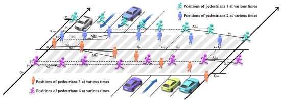 The YOLOv8-ByteTrack combination demonstrates significant advantages in pedestrian trajectory tracking. Initially, YOLOv8, as a detection model, offers high precision and real-time capabilities, swiftly identifying pedestrians and producing high-confidence detection boxes, while also preserving low-confidence targets for subsequent track matching. ByteTrack efficiently links detection boxes with tracks from previous frames using the IOU matching algorithm, ensuring the continuity of tracks. It integrates high- and low-confidence detection boxes to effectively address issues such as occlusions, target losses, or fluctuations in detection confidence. Additionally, ByteTrack employs Kalman filtering to smoothly update the state of tracks, enhancing the evaluation of pedestrian movement trajectories. Unmatched detection boxes can be initialized as new tracks and confirmed in later frames, further enhancing the system’s flexibility and adaptability. Overall, this combined approach exhibits outstanding robustness, accuracy, and real-time performance in complex scenarios such as pedestrian crossing, providing strong technical support for tracking tasks. The principle of pedestrian crossing feature parameter extraction is illustrated in Figure 3.