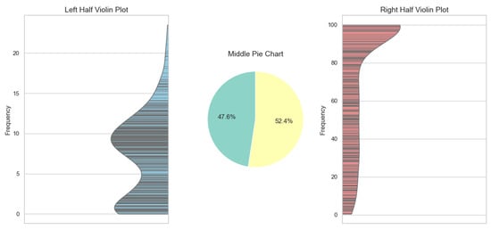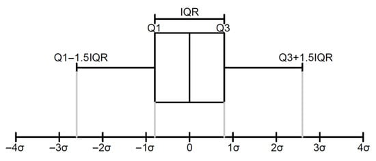 In view of the difference between pedestrian crossing behaviors and illegal driving behaviors, as well as the absence of explicit definition and judgment strategies, it is challenging to define whether pedestrian crossing behaviors are compliant. Consequently, this research assumes that the extracted feature parameters are capable of reflecting the abnormal degree of pedestrian crossing behaviors. At this point, the feature parameters of most pedestrians are concentrated within a reasonable interval, whereas the index values far away from this interval are identified as unreasonable values. With the acquisition of feature parameters at each moment during the process of pedestrian crossing, it is imperative to clarify the relevant threshold range of each parameter to determine its compliance. To this end, this research uses the following methods to determine the threshold: by drawing the distribution curves of various feature parameters based on pedestrian crossing trajectory–signal behavior spectrum, the interquartile range (IQR) is employed to determine the threshold of risky crossing behavior. IQR, initially proposed by Laurikkala [30], is a common method applied in outlier detection, which can be utilized to compute the outlier threshold of various distributed data. Notably, its principle is demonstrated in Figure 4. Based on IQR, the normalization of various feature parameters is implemented to eliminate the dimensional differences between different variables. More precisely, the data are divided into an abnormally low value, relatively low value, normal value, relatively high value, and abnormally high value, thereby constructing a standardized scoring system to score individual feature parameters. A feature closer to the center will be endowed with a higher score, suggesting the effectiveness of the feature parameter and a lower risk level during pedestrian crossing.