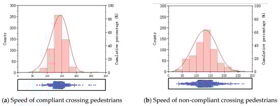 The distribution of pedestrian crossing lights is illustrated in Figure 8. In this section, the proportions of compliant pedestrians and non-compliant pedestrians are 47.6% and 52.4%, respectively, which are similar in proportion. In detail, the figure on the left shows the distribution of the remaining green-light time of the compliant pedestrian group, with the two main peaks appearing around 1 s and 9 s, respectively. As can be observed, a significant number of compliant pedestrians only complete their crossing behavior when the green light is about to end, with a relatively short remaining green-light time. This implies that this type of pedestrian faces greater time pressure and is therefore more inclined to accelerate. Moreover, when comparing the average speed of the two peak intervals, it is evident that the average speed of pedestrians near the remaining green-light time of 9 s is 1.35 m/s, whereas the average speed of pedestrians near 1 s is 1.44 m/s, which is clearly higher than the former. The figure on the right depicts the proportion of red-light time for non-compliant pedestrians (i.e., the ratio of red-light duration to crossing time). It indicates that the vast majority of non-compliant pedestrians are crossing the street while the crossing light is red, suggesting a higher likelihood of interaction between pedestrians and normal traffic. However, a small number of pedestrians present a lower proportion of red-light time, indicating that they have more limited interaction with normal traffic. Therefore, the risk they face when crossing is relatively lower than that of the former. When reviewing the video footage, such pedestrians can be broadly categorized into two groups: one group of pedestrians with a higher time preference is more likely to initiate crossing behavior in advance when the crossing light is about to turn green, whereas the other group of pedestrians tends to implement crossing behavior during the green-light phase, although they often encounter the crossing light turning red mid-crossing due to insufficient remaining green-light time.
