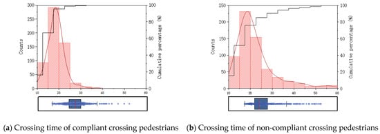 In addition, the video presents a resolution of 4096 pixels × 2160 pixels, with the frame rate of 25 frames per second. Based on YOLOv8-ByteTrack algorithm, automatic spatiotemporal recognition can be implemented for pedestrians in each frame, thereby extracting the real-time position and coordinate information of pedestrians. Furthermore, by analyzing the position change of pedestrians every second, their speed, acceleration, and required crossing time can be deduced. Moreover, in the interest of obtaining the crossing light status of pedestrians during their crossing, the manual marking method is utilized to record the remaining green-light time of compliant pedestrians after crossing as well as the red-light duration of non-compliant pedestrians during crossing. Eventually, the pedestrian crossing trajectory–signal behavior spectrum is constructed by integrating the algorithm recognition results and manual labeling data. Notably, the partial data of the behavior spectrum are outlined in Table 3.