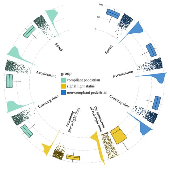 The normalized results of the feature parameters for compliant and non-compliant pedestrian groups are outlined in Figure 9.
