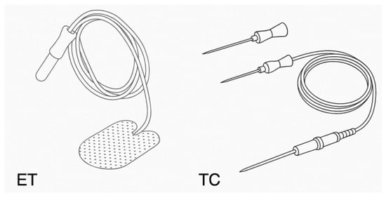 Electromyography has been used since the 1950s to assess laryngeal muscle activity [20]. In 1970, this technology was adapted for use in surgical settings by Flisberg K. and Lindholm T. [21]. Initially, needle electrodes were inserted into the vocal muscles through the cricothyroid membrane; these are now referred to as thyroid cartilage (TC) electrodes. Later developments led to the use of laryngoscopically placed electrodes, which were positioned outside the surgical site [22,23]. Over the following 10–15 years, the electrodes were significantly miniaturized, allowing integration with endotracheal tubes. These are currently known as endotracheal (ET) electrodes. TC and ET electrodes are the two primary types used in EMG-based IONM, as illustrated in Figure 1.