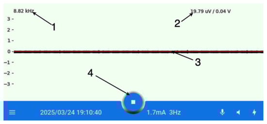 The main screen of the application: (1)—frequency of a signal measurement; (2)—current voltage; (3)—EMG signal; (4)—navigation menu.