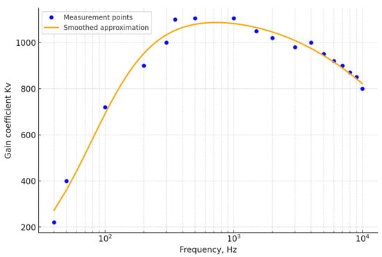 In Figure 6, the principal schematic diagram of the operational amplifier of the EMG sensor signal is presented, while Figure 7 illustrates the amplitude–frequency response of the EMG sensor signal amplifier. In the graph, the measurement results of the gain coefficient at different frequencies are shown as blue dots. As can be observed, the response remains relatively linear from 300 Hz to several kilohertz. The primary objective in the process of recurrent laryngeal nerve detection is the determination of the maximum amplitude of the EMG signal, since this amplitude reflects the distance between the site of stimulation on the surgical wound and the recurrent laryngeal nerve. As noted in [30], when needle EMG sensors implanted into the muscle tissue of the vocal folds are used, the main portion of the spectral power of this signal is concentrated within the range of 300 Hz to 1 kHz (and above). This finding was also confirmed by the authors during the course of preliminary studies. Therefore, the frequency response of the amplifier within this range can be considered satisfactory, ensuring effective signal amplification.