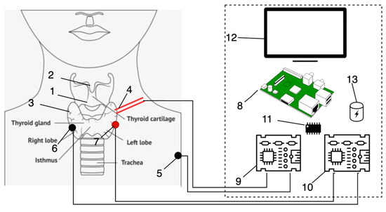 Hardware architecture of complex: (1)—surgical area; (2)—larynx; (3)—vocal cords; (4)—active probe; (5)—passive probe; (6)—negative electrode; (7)—positive electrode; (8)—Raspberry Pi 5; (9) electrical current generator; (10)—EMG sensor; (11)—ADC; (12)—Led screen; (13)—UPS.