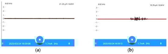 When the tissues near the RLN are stimulated, a bioelectric potential is generated in the vocal fold muscles. This potential is captured by the EMG sensor. A working hypothesis is proposed: the closer the stimulating electrode is to the RLN, the greater the amplitude of the potential difference recorded between electrodes (Figure 3 (6) and (7)). This difference is then processed by the hardware–software system.