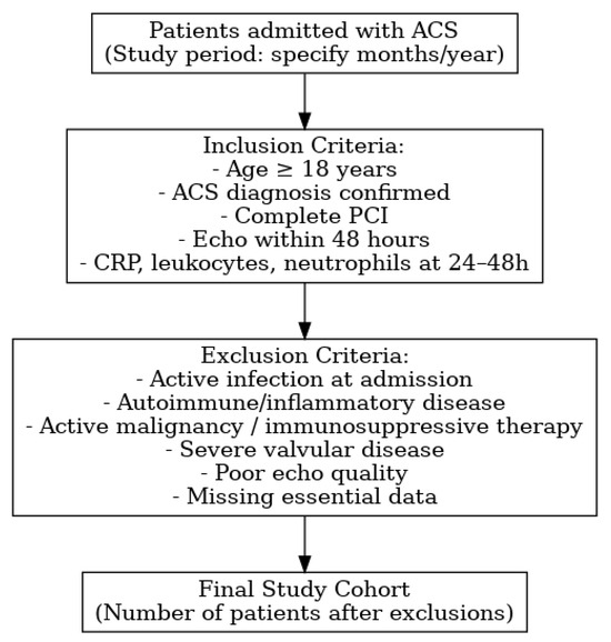 This retrospective observational study included consecutive patients diagnosed with acute coronary syndrome (ACS) and treated with percutaneous coronary intervention (PCI) in a tertiary interventional cardiology center. The study included consecutive ACS patients treated with PCI between January 2020 and December 2023. Eligible patients were aged ≥18 years, had an ACS diagnosis confirmed by clinical presentation, electrocardiographic changes, and/or elevated cardiac biomarkers, and underwent complete coronary revascularization by PCI. In addition, only patients with available post-procedural echocardiographic assessment (within 48 h), including diastolic function parameters, and with inflammatory markers—C-reactive protein (CRP), total leukocyte count, and neutrophils—measured at 24–48 h post-PCI, were included.