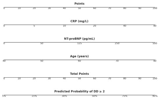 The score was constructed using a pragmatic point-based approach, assigning 1 point each for age ≥ 65 years, NT-proBNP > 125 pg/mL, and CRP > 10 mg/L. Thus, the score ranges from 0 to 3 points, with a threshold of ≥2 points identifying patients at higher risk of moderate-to-severe DD.