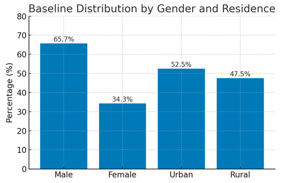 In Figure 3 is presented the baseline distribution of study participants by gender and residence. The cohort included a higher proportion of male patients (65.7%) compared to female patients (34.3%). Slightly more than half of the participants resided in urban areas (52.5%), with 47.5% from rural regions. This distribution reflects the referral population and the higher ACS burden in males and urban residents.