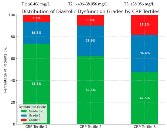 Distribution of diastolic dysfunction grades according to post-procedural CRP tertiles. Percentages represent the proportion of patients within each tertile exhibiting Grade 0–1, Grade 2, or Grade 3 dysfunction.