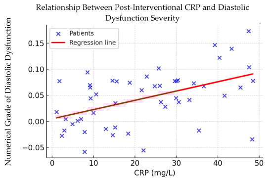 To further explore the relationship between systemic inflammation and diastolic dysfunction, a simple linear regression model was constructed using post-procedural CRP as the independent variable and the numerical grade of diastolic dysfunction as the dependent variable.
