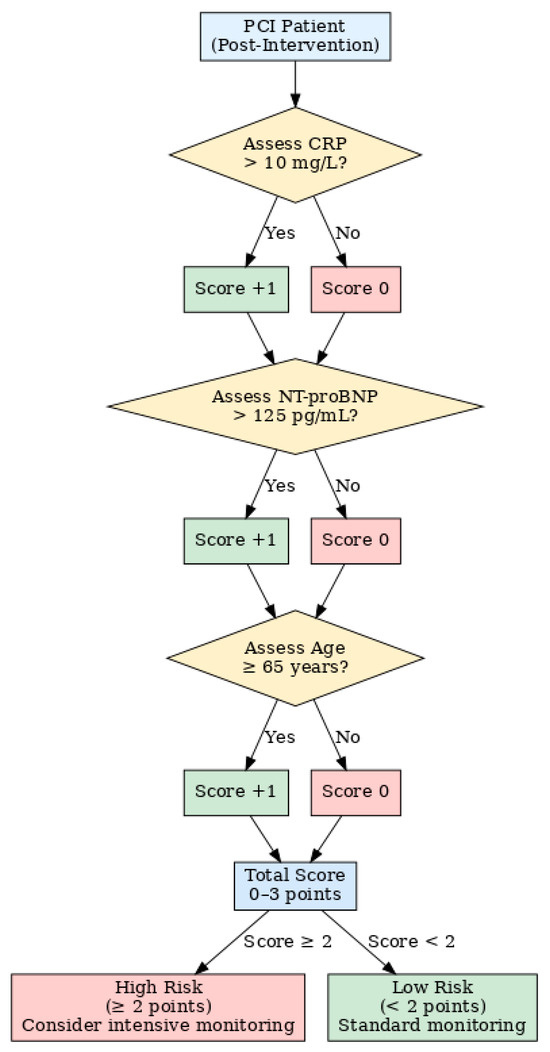 Preliminary risk Assessment algorithm for post-PCI diastolic dysfunction. Flowchart illustrating the proposed point-based risk score derived from multivariable analysis. CRP, NT-proBNP, and age are evaluated post-intervention to assign a total score (0–3 points). A score ≥ 2 identifies patients at high risk for moderate-to-severe diastolic dysfunction, suggesting the need for intensive monitoring.