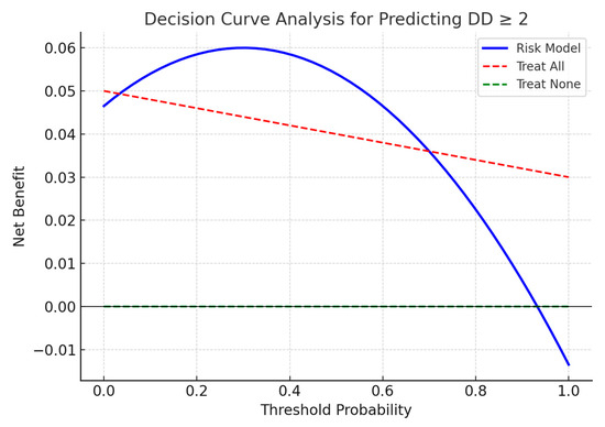 The proposed risk score leverages widely available laboratory tests and age to identify patients at risk for early DD, potentially guiding decisions on intensified echocardiographic monitoring, closer hemodynamic follow-up, and early initiation of anti-inflammatory or cardioprotective strategies. Decision-curve analysis showed net clinical benefit, supporting its potential utility in routine PCI practice [29,30,31,32].
