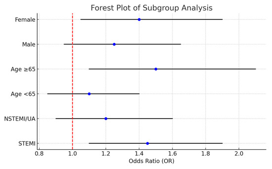 Forest plot of subgroup analyses evaluating predictors of moderate-to-severe diastolic dysfunction (DD ≥ 2) after PCI. Odds ratios (ORs) and 95% confidence intervals (CIs) are shown for key patient subgroups (STEMI vs. NSTEMI/UA, age <65 vs. ≥65 years, and male vs. female). The vertical dashed line indicates OR = 1 (no association). Results show consistent trends across subgroups, supporting the robustness of the main model.