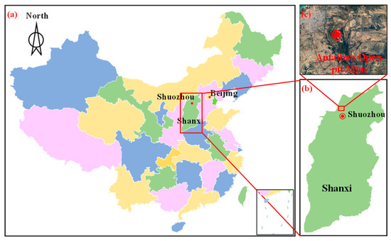 The coal sandstone rock samples for the test were sourced from the An Taibao open-pit coal mine in Shanxi, China (as shown in Figure 1). The component analysis (XRD) reveals the composition as 78.0% quartz, 6.8% feldspar, 9.4% muscovite, and 5.8% clay minerals. The clay mineral composition, characteristic of medium-coarse sandstones, consists of 76% illite, 21.3% kaolinite, and 2.7% montmorillonite. The prepared cylindrical specimen, measuring 100 mm in height and 50 mm in diameter, complies with the ‘International Society for Rock Mechanics Test Procedure (ISRM2007)’ and the ‘Standard for Testing Methods for Engineering Rocks GB/T50266-2013’ [30]. The specimens underwent processing and testing. After excluding rock specimens with significant discrepancies, the processed samples were evaluated for mass, height, diameter, wave velocity, and porosity. The characteristic parameters of these specimens are presented in Table 1.