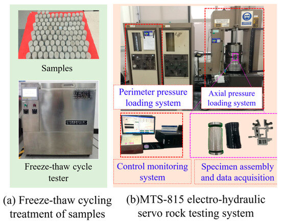 The test utilized the XY-QDR-50 full-automatic low-temperature freeze–thaw cycle testing machine, the MTS815 electro-hydraulic servo rock testing system, and the DS5-8B acoustic emission acquisition system, respectively. The specific test process is as follows: