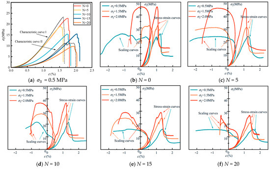 Under a constant perimeter pressure and after 5 to 10 freeze–thaw cycles, the stress–strain curves exhibit four distinct stages: compression density, near-linear elasticity, crack nonlinear extension, and post-peak behavior. The peak stress shows an instantaneous drop, indicating typical brittle damage characteristics, classifying the curve as type I. At 15 and 20 freeze–thaw cycles, the stress–strain curve stages resemble those at lower cycle counts, but the peak exhibits a fluctuating decline, indicating ductile damage characteristics typical of a class II curve. For 15 and 20 freezing-thawing cycles, the stress–strain curve mirrors that of fewer cycles but exhibits a fluctuating decline post-peak, indicating ductile damage characteristics typical of class II curves. The divergence between class I and class II stress–strain curves primarily occurs post-peak, indicating that the mechanical behavior of coal sandstone is somewhat influenced by the number of freeze–thaw cycles.