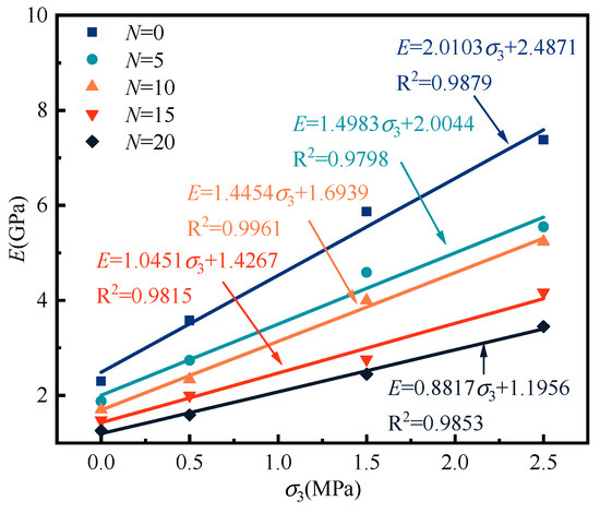 The influence of perimeter pressure on the elastic modulus of sandstone specimens was significantly affected by the number of freeze–thaw cycles. The impact of peripheral pressure on the elastic modulus of specimens is more pronounced at lower freezing and thawing cycles (0, 5, and 10) compared to higher cycles (15 and 20). This is because repeated cycles significantly damage the internal structure of sandstone specimens, weakening the load-bearing capacity of the skeleton particles. The internal structure of the sandstone specimen suffers significant damage after numerous freeze–thaw cycles, weakening the load-bearing capacity of the skeleton particles. Consequently, its deformation resistance becomes less sensitive to peripheral pressure, leading to a reduced growth slope.