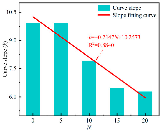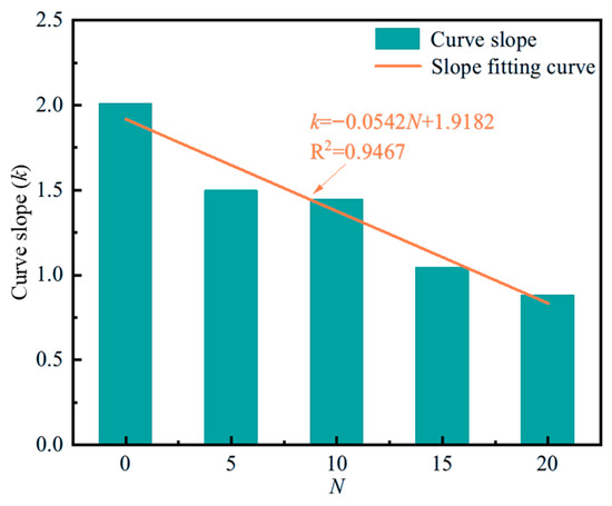 Figure 5 illustrates the relationship curves between the average elastic modulus of coal sandstone and enclosing pressure levels across varying freeze–thaw cycles, with the fitted slope depicted in Figure 6 concerning the frequency of freeze–thaw cycles.