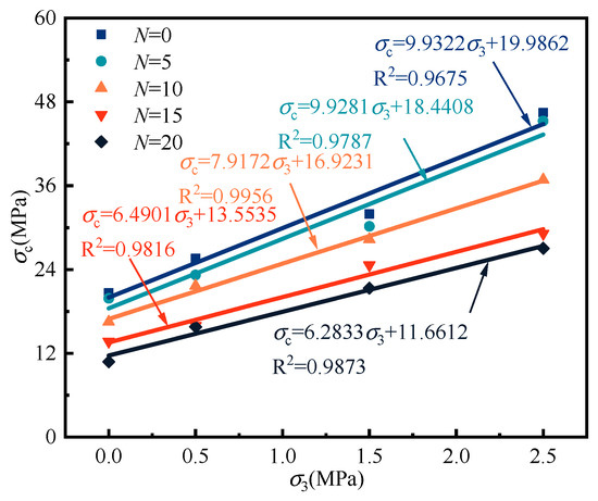 As the number of freeze–thaw cycles increases, the slope of the peak strength curve for coal sandstone gradually decreases with higher enclosing pressure levels. The slope of the fitted curve is 9.63 with zero freeze–thaw cycles and 10.27 with five cycles. As the cycles increase to 10, 15, and 20, the slope decreases to 7.92, 6.49, and 6.28, respectively. The analyses indicate that peripheral pressure significantly impacts peak strength, particularly at a low number of cycles, primarily due to the high frequency of freeze–thaw cycles. The analyses indicate that peripheral pressure significantly impacts the specimen’s peak strength at low cycle times. This is primarily because the specimen’s internal structure suffers severe damage at high freeze–thaw cycles, reducing the sensitivity of peripheral pressure’s strengthening effect on peak strength, which in turn causes a gradual decrease in the curve’s slope.