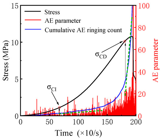 Acoustic emission characteristic parameters, such as ring count, energy, amplitude, duration, rising time, and average frequency, can characterize the acoustic emission signals of coal sandstone specimens in the loading process from multiple angles. The specific characterization of these parameters in the acoustic emission waveform is shown in Figure 8. Meanwhile, a large amount of elastic energy will be released during the deformation and destruction and strength weakening of the rock, and the degree of elastic energy released varies in different loading stages. These energies can be collected by acoustic emission technology and presented in the form of waveform signals, which provides a basis for acoustic emission parameters to characterize rock deformation damage and crack extension. Research indicates that analyzing slope mutation points on the ‘cumulative AE parameter versus time’ curve can identify rock crack initiation and damage thresholds [31,32,33]. Figure 10 illustrates the specific characterization method commonly employed in studying rock fracture behavior. Figure 11 shows the acoustic emission parameter characteristics of sample damage and fracture.