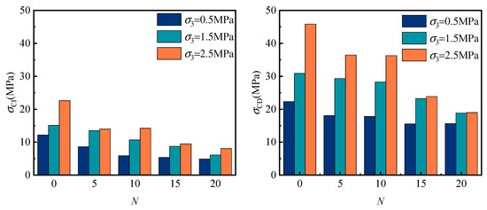 Figure 17 and Table 2 present the histograms of crack initiation and damage thresholds across varying σ3 and N conditions. Table 2 presents the crack initiation and damage thresholds, along with their ratios to peak stress, across various peripheral pressures and N, as illustrated in Figure 17 and Table 2. As shown in Figure 17 and Table 2, the crack initiation and damage thresholds of sandstone specimens rise with increasing peripheral pressure levels under a given number of freeze–thaw cycles. With N = 10, increasing the peripheral pressure from 0.5 MPa to 2.5 MPa raised the crack initiation stress threshold by 8.32 MPa and the damage stress threshold by 18.47 MPa, representing increases of 1.40 times and 1.04 times, respectively. The increase in peripheral pressure significantly inhibits crack initiation, extension, and penetration in coal sandstone specimens by raising the stress threshold necessary for crack initiation and unstable growth, thereby enhancing the specimens’ deformation resistance and strength.