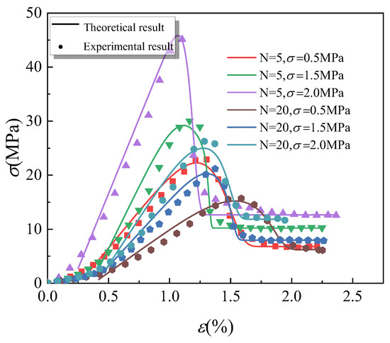To validate the model’s accuracy, stress–strain curves under varying circumferential pressures, with freeze–thaw cycles of 5 and 20, were chosen for parameter fitting and verification. Table 4 presents the initial parameters for the validation model and the relative error of the results, while Figure 20 illustrates the comparison between test outcomes and theoretical model calculations.