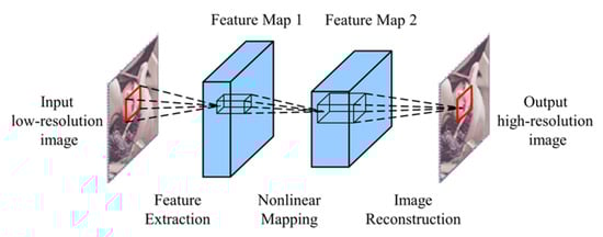 The SRCNN algorithm [31] is a deep learning based super resolution method characterized by its simple architecture and low reconstruction distortion, enabling effective image super resolution processing. As shown in Figure 3, the SRCNN model consists of three fundamental layers: feature extraction layer, nonlinear mapping layer, and image reconstruction layer.