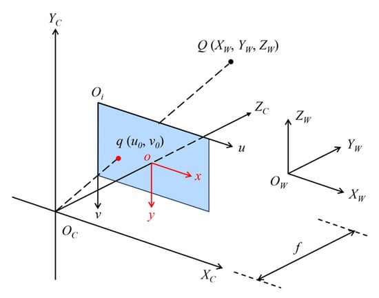 Camera calibration is carried out to establish the projection transformation between a three-dimensional point in space and its corresponding two-dimensional point in the image. As shown in Figure 5, the projection relationship between a spatial point Q and its corresponding image coordinate q can be expressed by Equation (4) [32]: