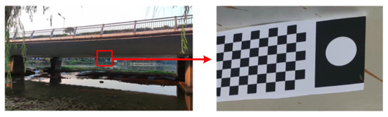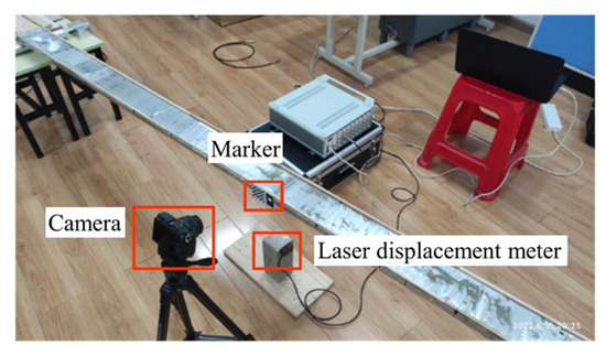 The experimental structure was a simply supported aluminum bridge with a total length of 3 m and a span of 2.9 m. The bridge cross-section was rectangular, measuring 0.12 m in width and 0.02 m in thickness. Key experimental equipment included a camera, a laser displacement sensor, a tripod, a checkerboard calibration target, and a circular marker. The camera employed was a Canon EOS 5D Mark IV equipped with a 55 mm fixed-focus lens (aperture f/1.7) (Canon Inc., Wuhan, China). The video resolution was set to 1920 × 1080 p with a frame rate of 50 fps, and the distance between the camera and the marker was maintained at 30 cm. The laser displacement sensor sampling frequency was 128 Hz. A printed 6 × 8 checkerboard pattern with cell dimensions of 7 mm × 7 mm was used for calibration, alongside white circular markers of 14 mm radius. The checkerboard and markers were affixed to the side surface at the mid-span of the aluminum bridge. The laser displacement sensor was positioned beneath the bridge at the marker location, as illustrated in Figure 6. An initial displacement was induced using the suspended weight method. After sudden release by cutting the suspending thread, both the laser displacement sensor and camera recorded the free-decay vibration response.
