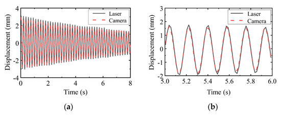 Comparison between experimental and reference measurements on the laboratory test bridge: (a) Overall view of displacement time history obtained by the camera (vision−based method) and the laser displacement meter (reference experiment); (b) Zoomed-in comparison at 5–6 s.