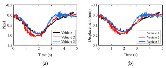Figure 9 presents the identified mid-span displacements of the bridge during passages of three vehicles. It is evident that the displacements in the pixel coordinate system operate at the sub-pixel level (<1 pixel) when vehicles traverse the bridge. After coordinate transformation, the measured maximum displacement values did not exceed 0.2 mm. These results demonstrate that the proposed algorithm achieves high-precision identification of minute structural displacements.