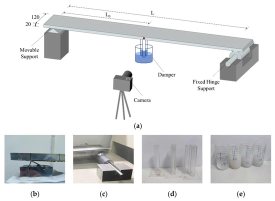 Schematic illustration of the test protocol (mm). (a) Schematic diagram of the experimental setup; (b) Moveable support; (c) Fixed hinge support; (d) Plastic tube; (e) Damping fluid.